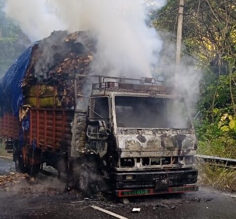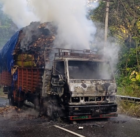 ಮಡಿಕೇರಿ ಬಳಿಯ ದೇವರ ಕೊಲ್ಲಿ ಎಂಬಲ್ಲಿ ಗೂಡ್ಸ್ ಲಾರಿ ಬೆಂಕಿಗೆ ಆಹುತಿ.