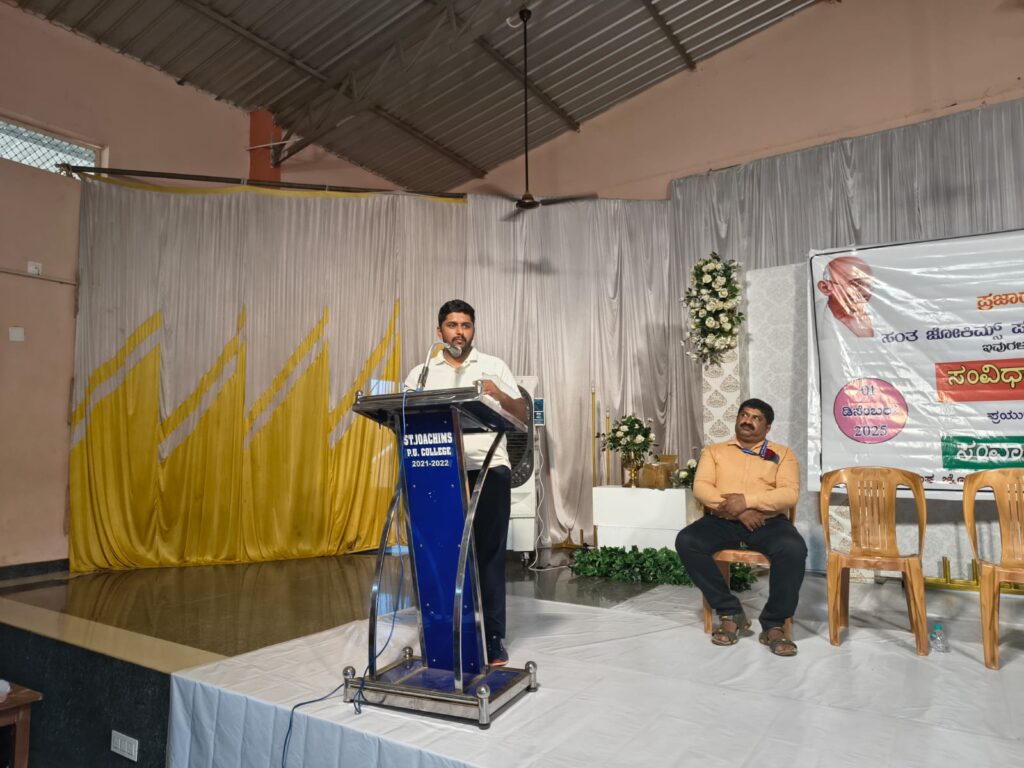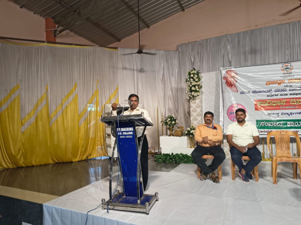 ಡಿ.1 ನವೆಂಬರ್ 26 ರ ಸಂವಿಧಾನ ದಿನಾಚರಣೆ ಮತ್ತು ಪಿಯು ವಿದ್ಯಾರ್ಥಿಗಳೊಂದಿಗೆ ಸಂವಾದ ಕಾರ್ಯಕ್ರಮ ಸಂತ ಜೋಕಿಮ್ಸ್ ಪದವಿ ಪೂರ್ವ ಕಾಲೇಜ್ ಸಭಾಭವನದಲ್ಲಿ ಪ್ರಜಾಧ್ವನಿ ಕರ್ನಾಟಕ ಹಾಗೂ ಸಂತ ಜೋಕಿಮ್ಸ್ ಪದವಿ ಪೂರ್ವ ಕಾಲೇಜಿನ ಸಹಭಾಗಿತ್ವದಲ್ಲಿ ನಡೆಯಿತು.